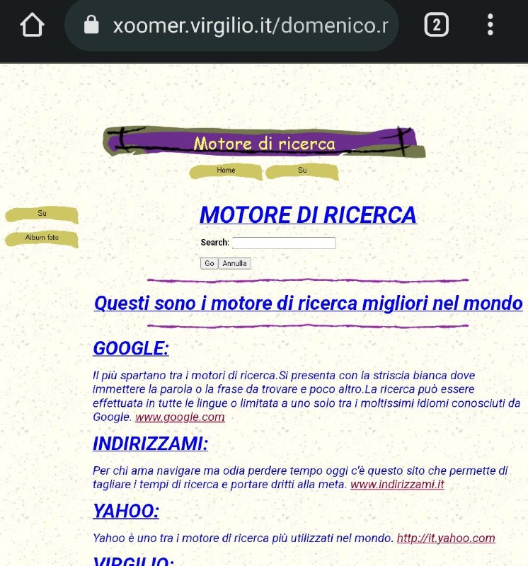 Google: il più spartano tra i motori di ricerca, solo la barra bianca Penso che sia quello lo scopo del motore di ricerca, non avere una home page piena di notizie a caso (e Google nell'app mobile oggi ci si avvicina) Chissà quanti anni ha sta pagina https://xoomer.virgilio.it/domenico.marzulli/MOTORE_DI_RICERCA.HTM