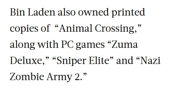 Bin Laden played Zuma Deluxe?!?!?!? https://www.thejakartapost.com/life/2017/11/05/osama-the-gamer-a-list-of-bin-ladens-video-games-from-his-hard-drive-.html